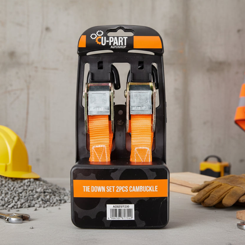 Heavy-duty cam buckle strap designed for secure and reliable load restraint. Features plastic-coated S-hooks to help protect surfaces and reduce wear. Rated with a minimum breaking strength of 750 kg for dependable performance. The cam buckle includes an easy thumb-release mechanism with automatic locking for fast, secure tightening. Adjustable length from 300 mm up to 1.9 m, allowing flexible use without twisting or tangling. Supplied in a Kaufmann blister pack for convenient retail display. For optimal strength and safety, ensure hooks, buckles, and ratchets are aligned with the direction of pull.